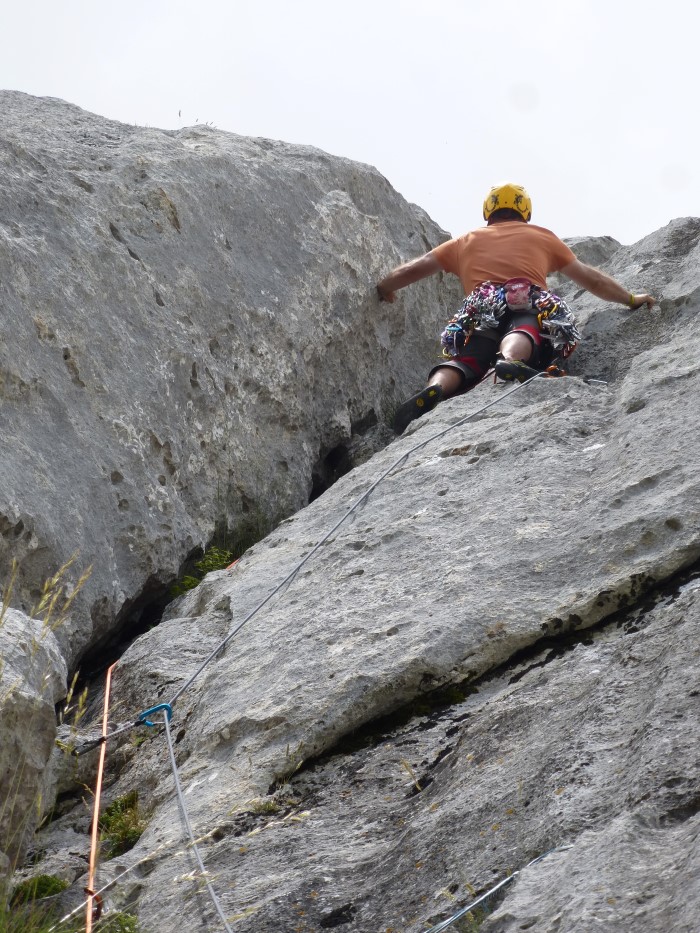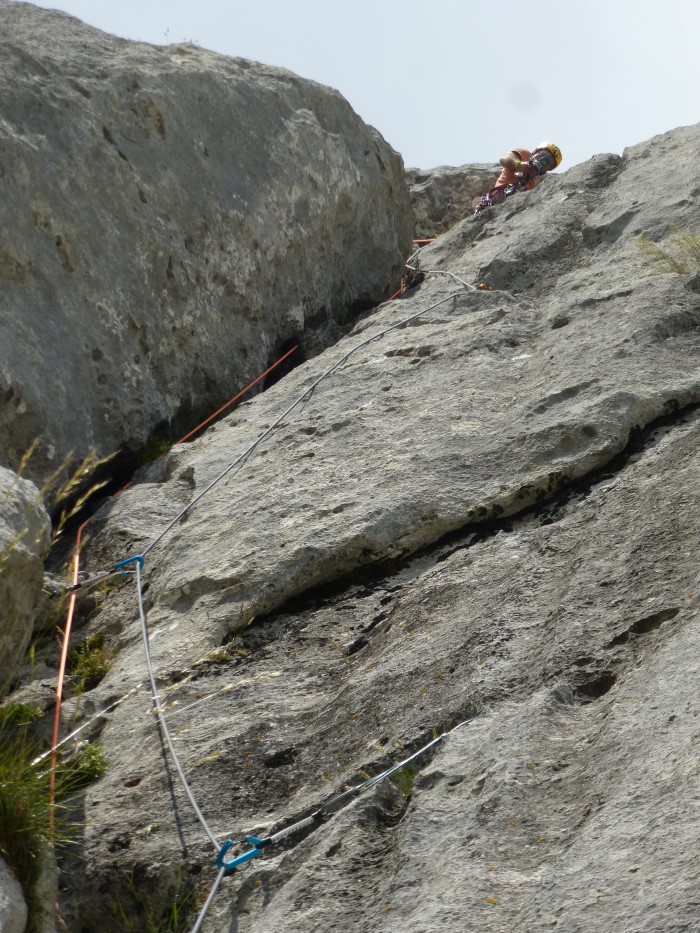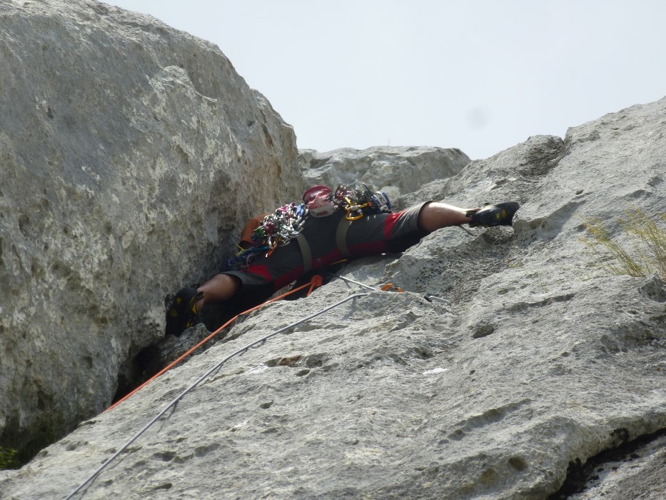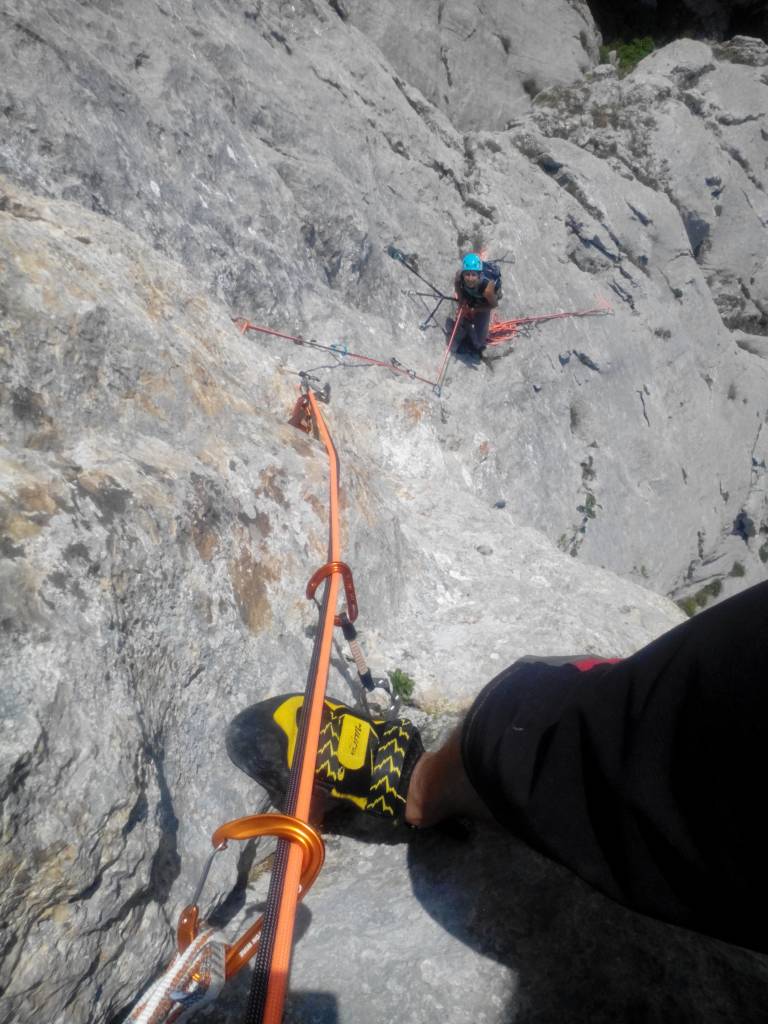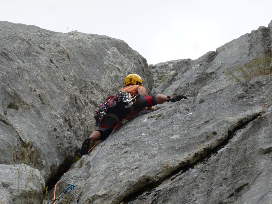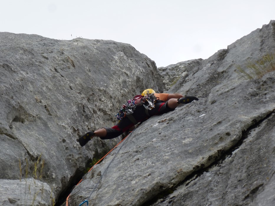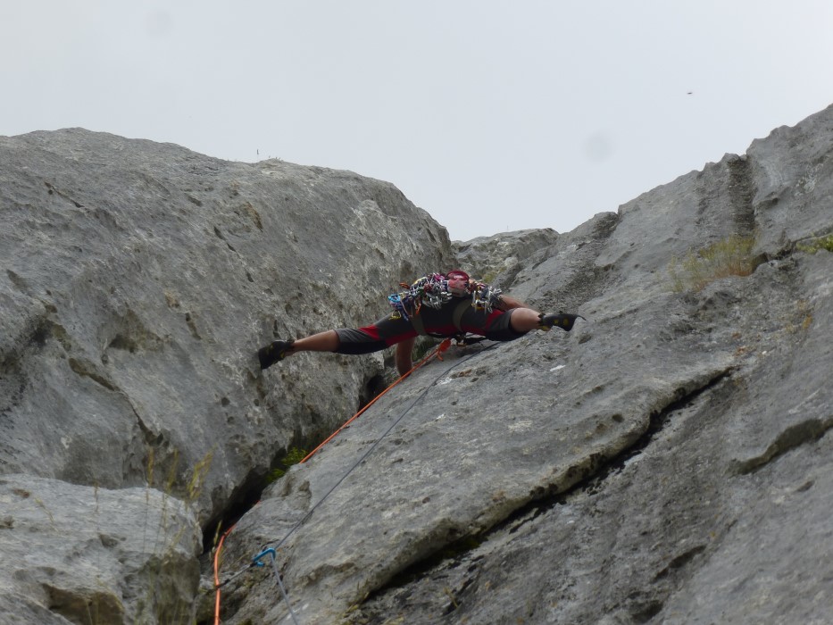 Tramo del 6c+ . Tras un par de intentos desisto, y acero los tres primeros clavos hasta la chapa, desde la cual salgo en libre bien. Después de pasar el 6c+ y Leti en la reunión.