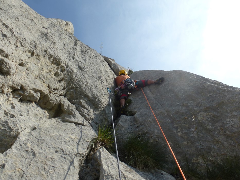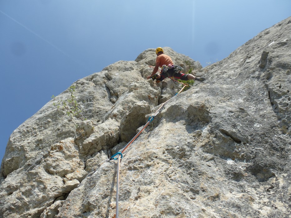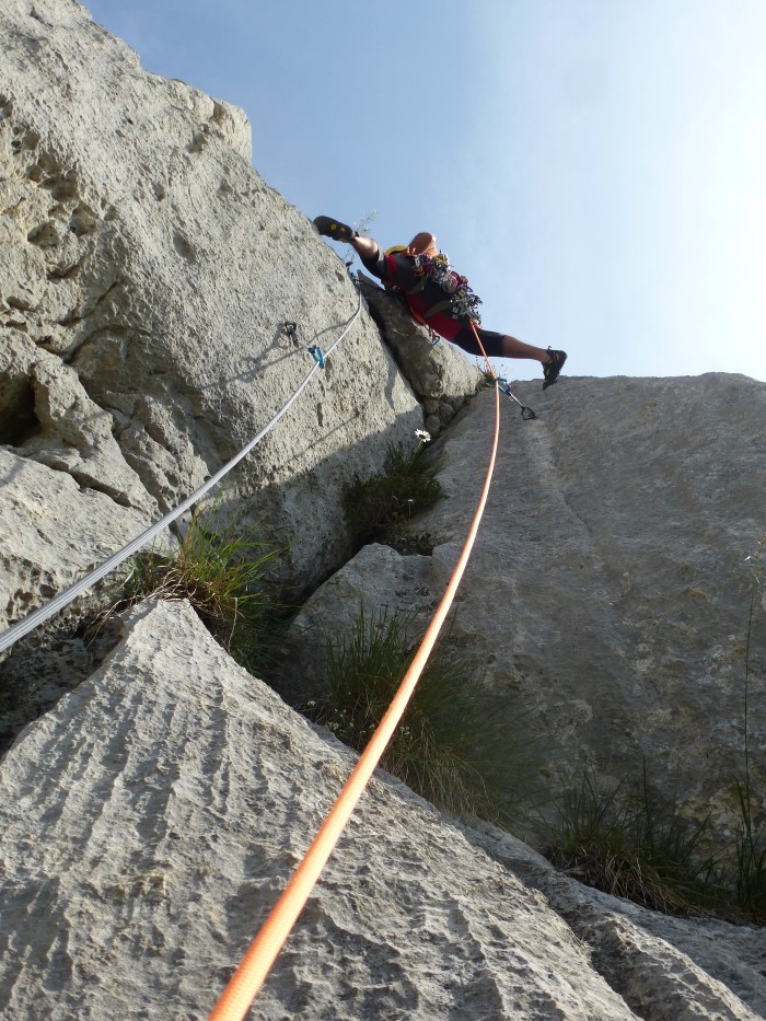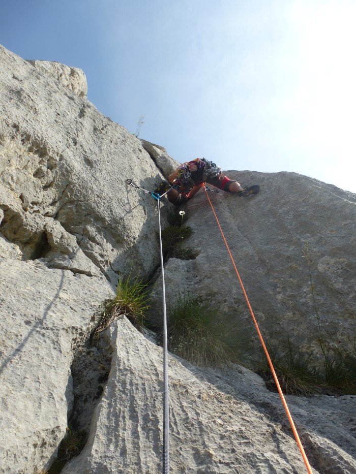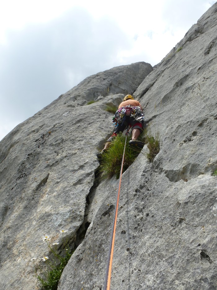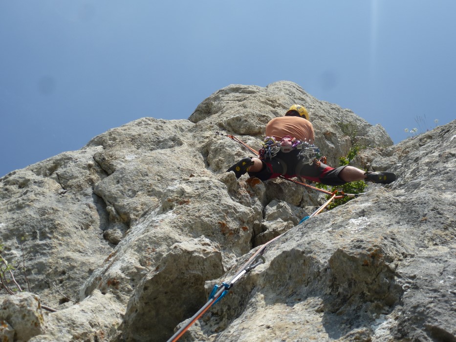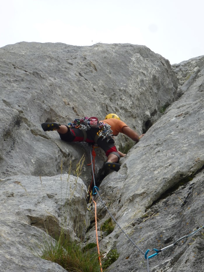 Tramo del 6c+ . Tras un par de intentos desisto, y acero los tres primeros clavos hasta la chapa, desde la cual salgo en libre bien. Después de pasar el 6c+ y Leti en la reunión.