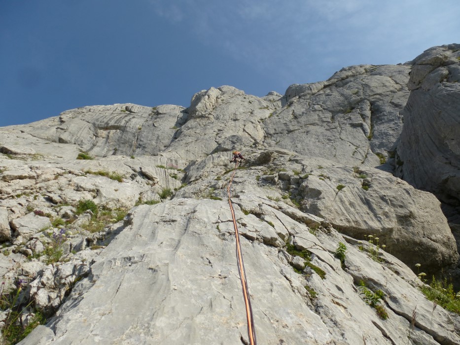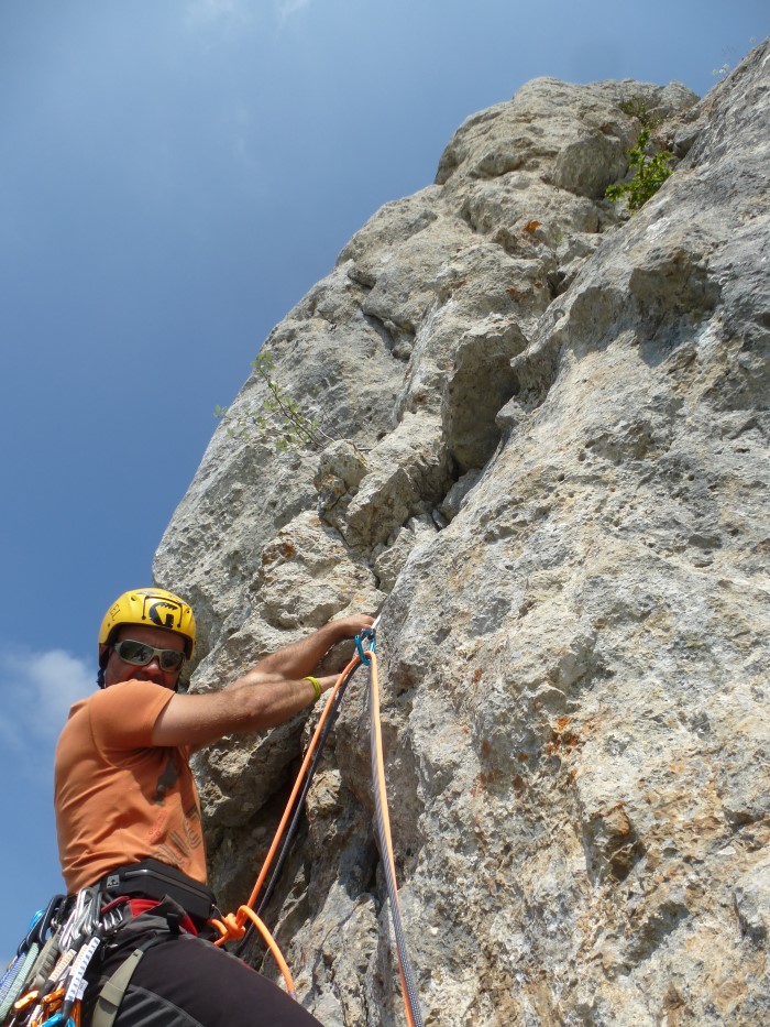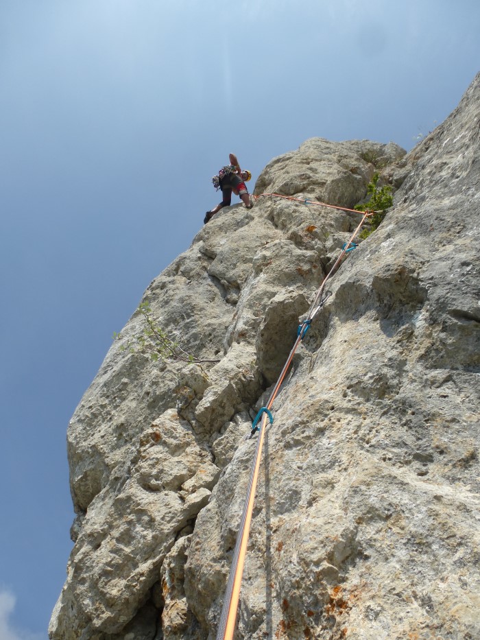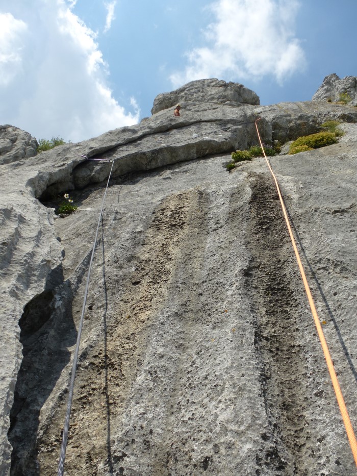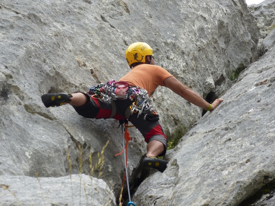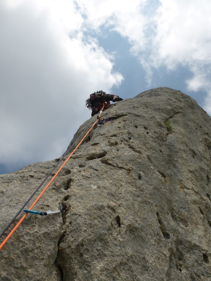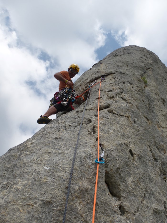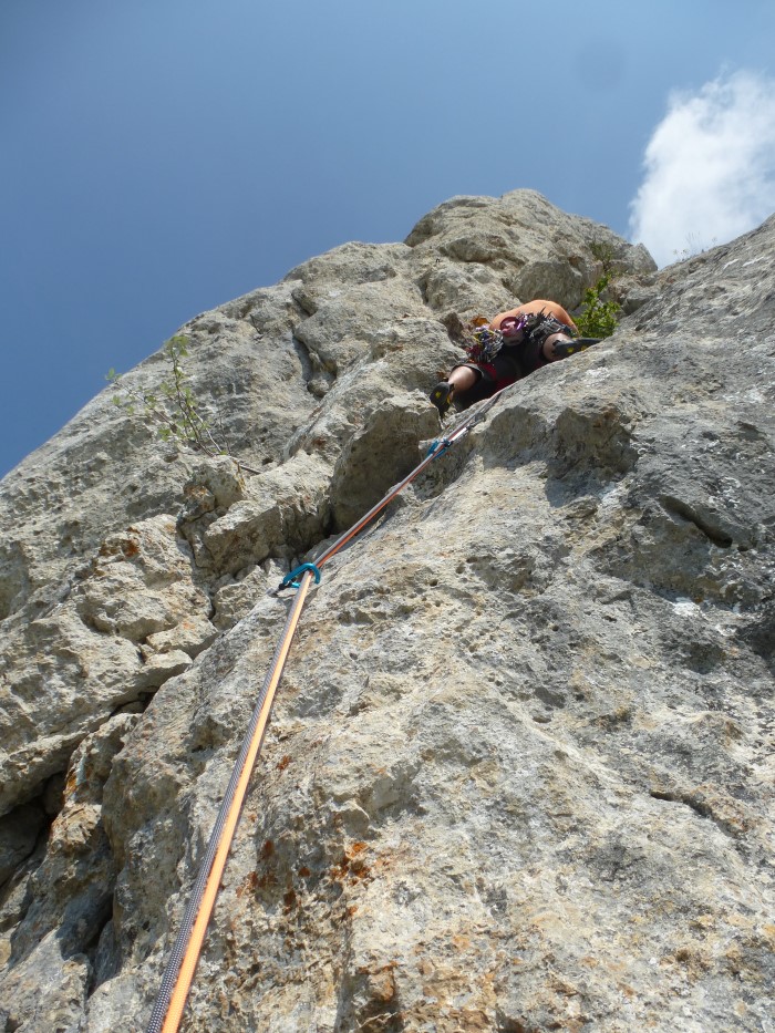 Tramo del 6c+ . Tras un par de intentos desisto, y acero los tres primeros clavos hasta la chapa, desde la cual salgo en libre bien. Después de pasar el 6c+ y Leti en la reunión.