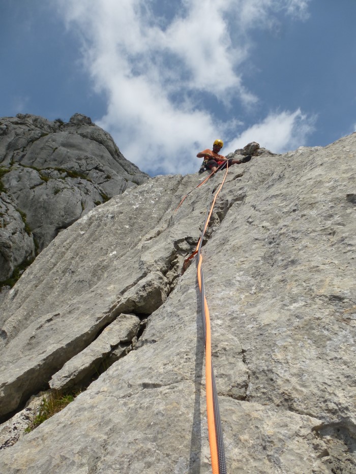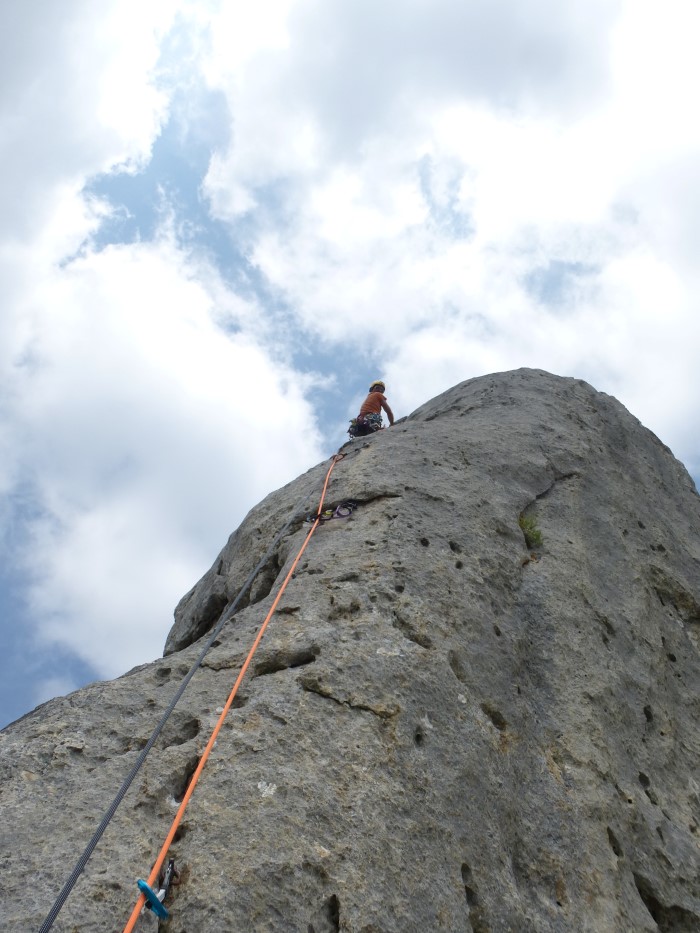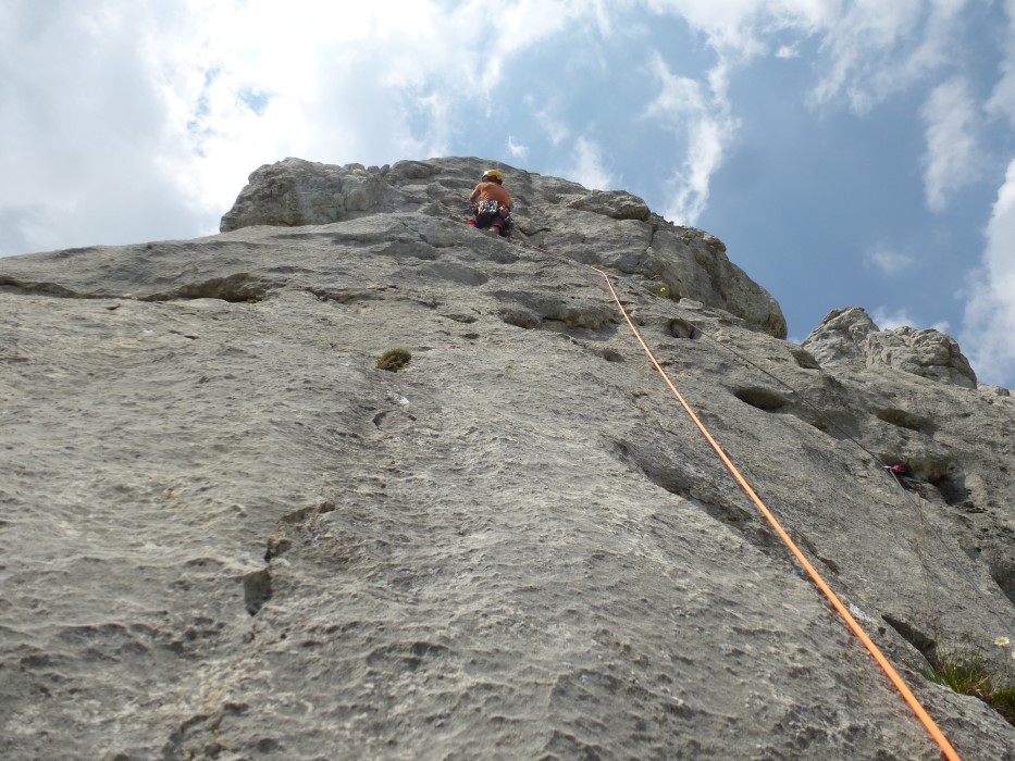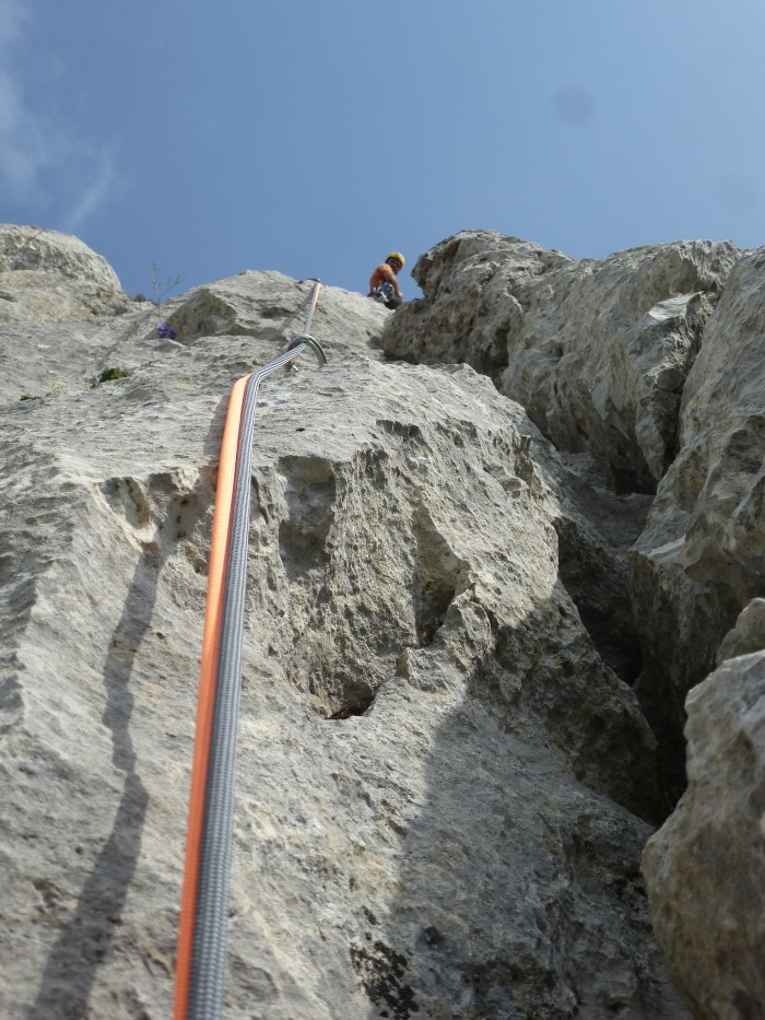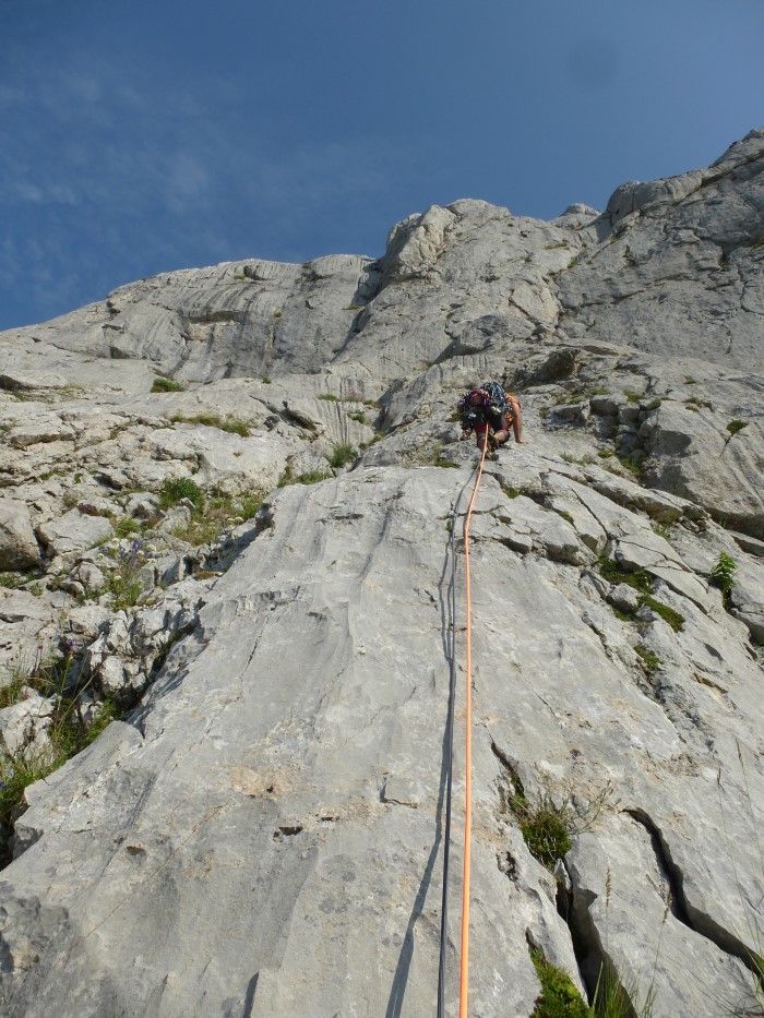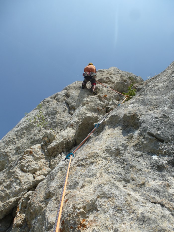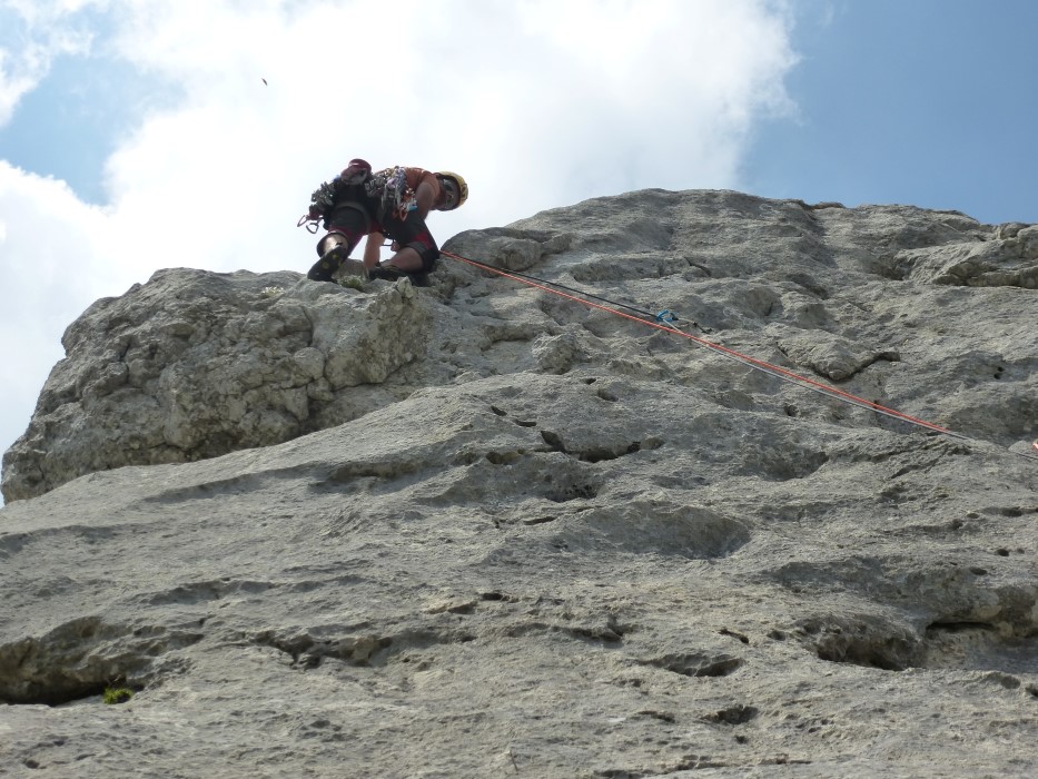 Tramo del 6c+ . Tras un par de intentos desisto, y acero los tres primeros clavos hasta la chapa, desde la cual salgo en libre bien. Después de pasar el 6c+ y Leti en la reunión.