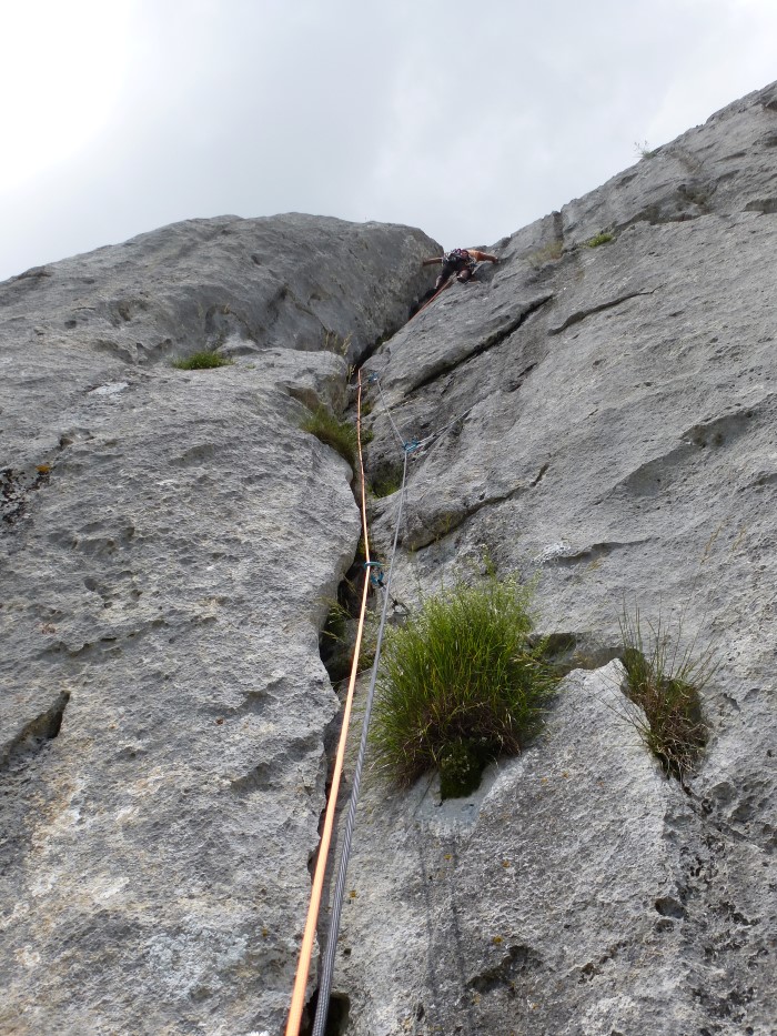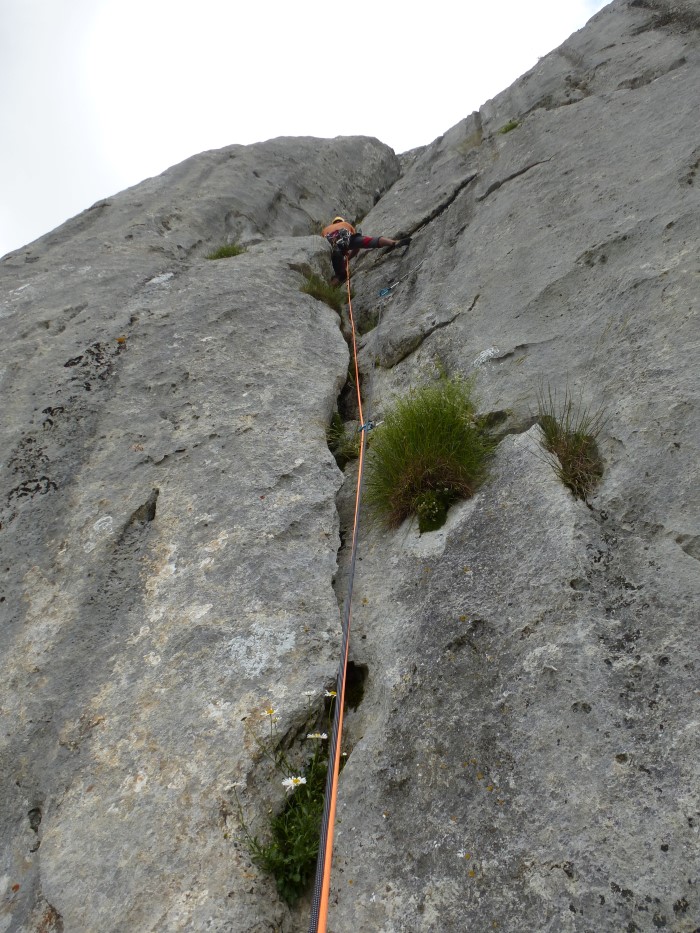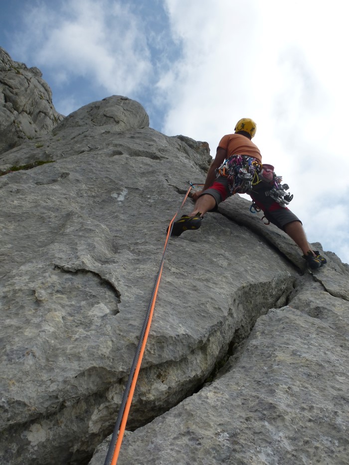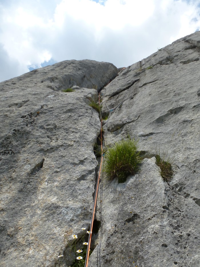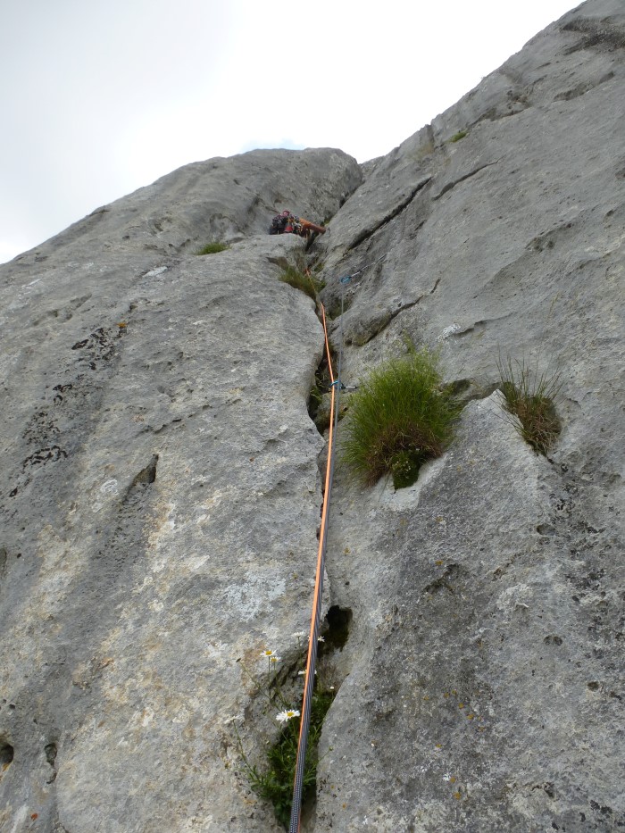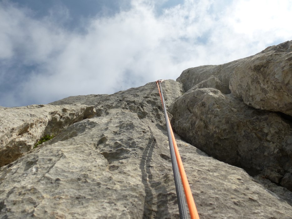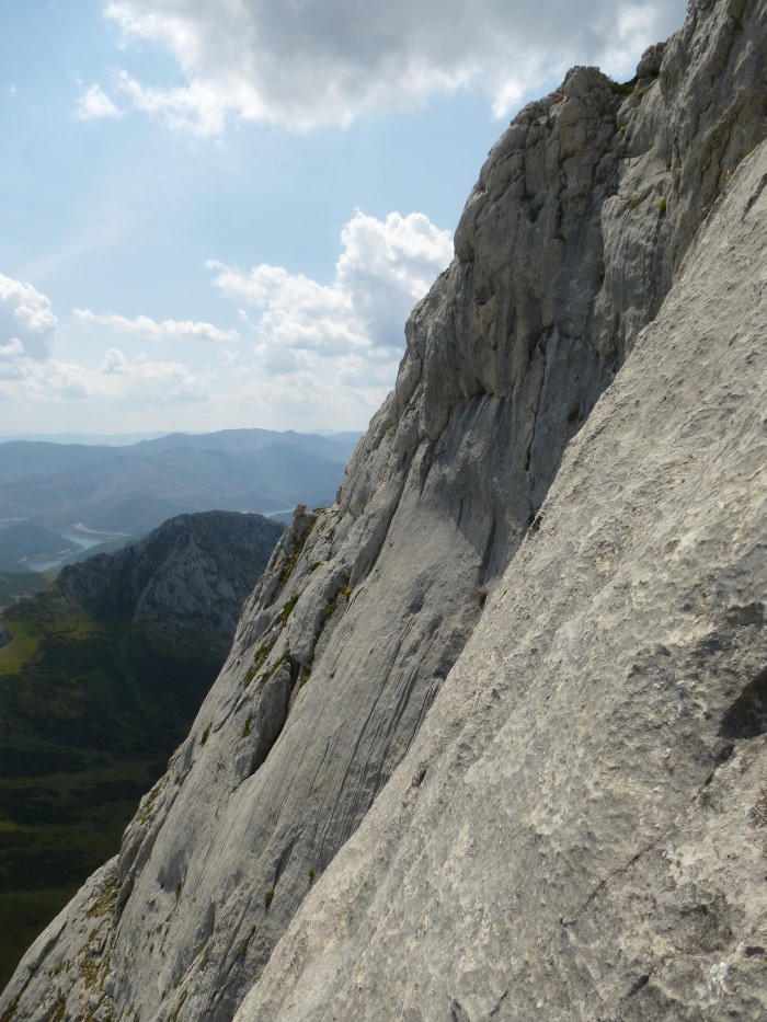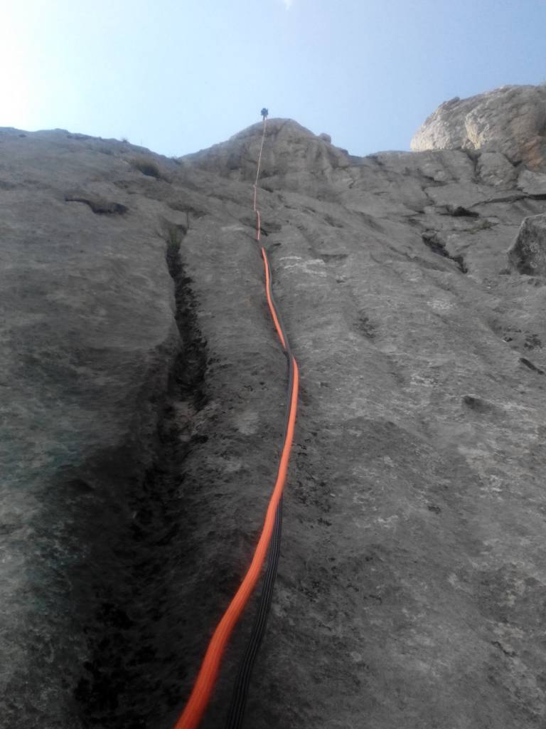 2º largo, 6a+/IV+. Secuencia del diedro de 6a+. Un poco raro si no se acierta con los pasos, bien asegurado con dos chapas y un cintajo.