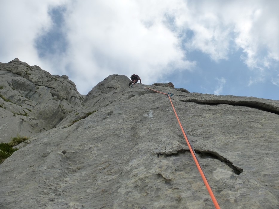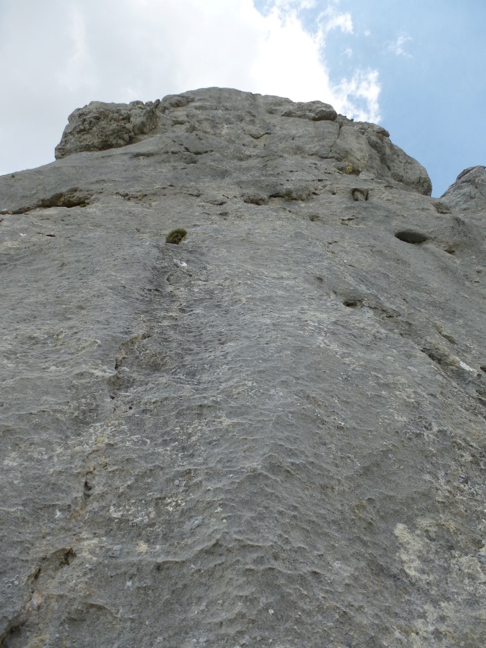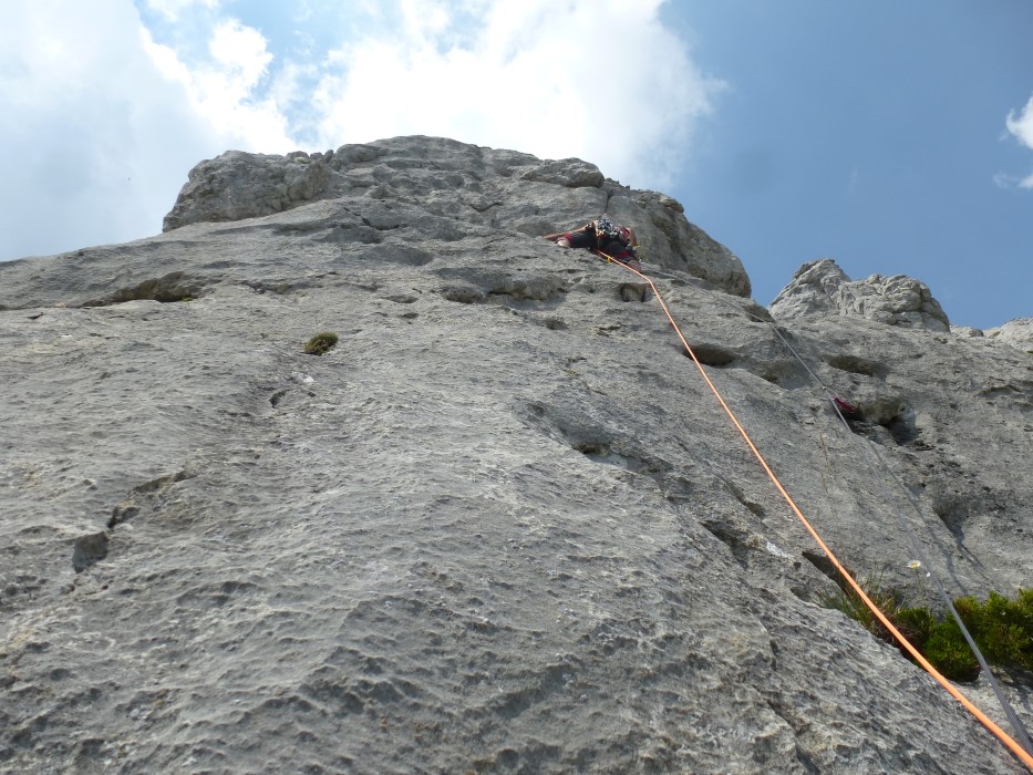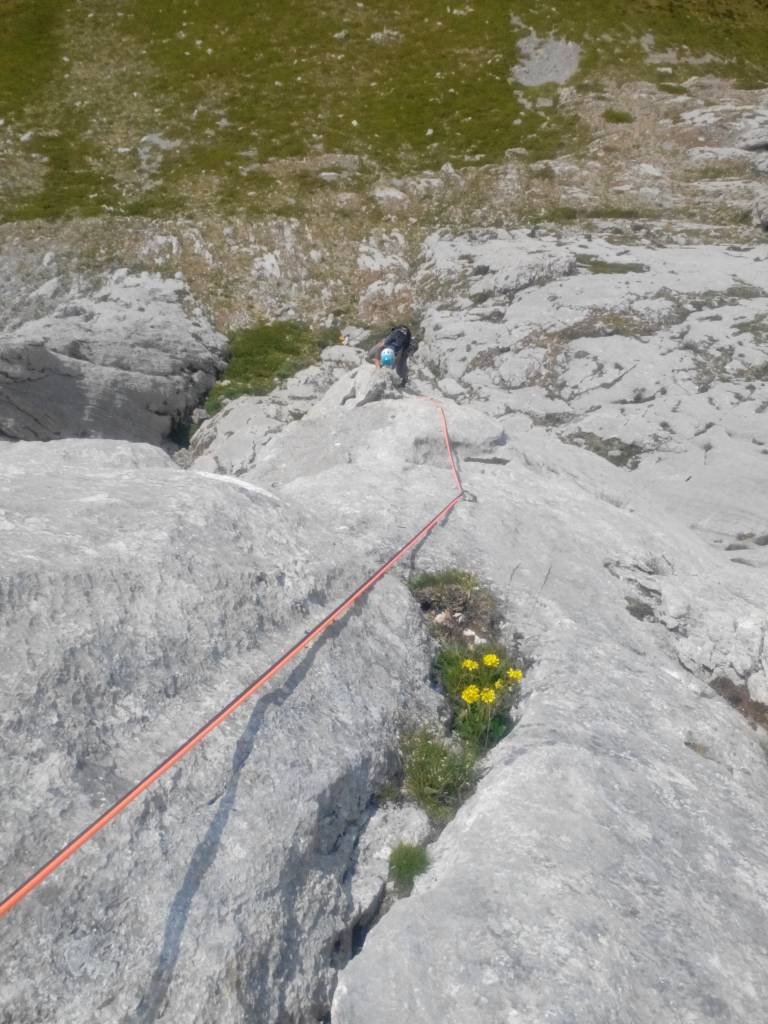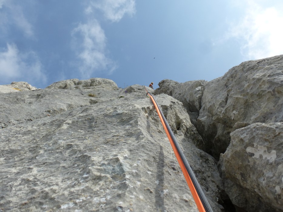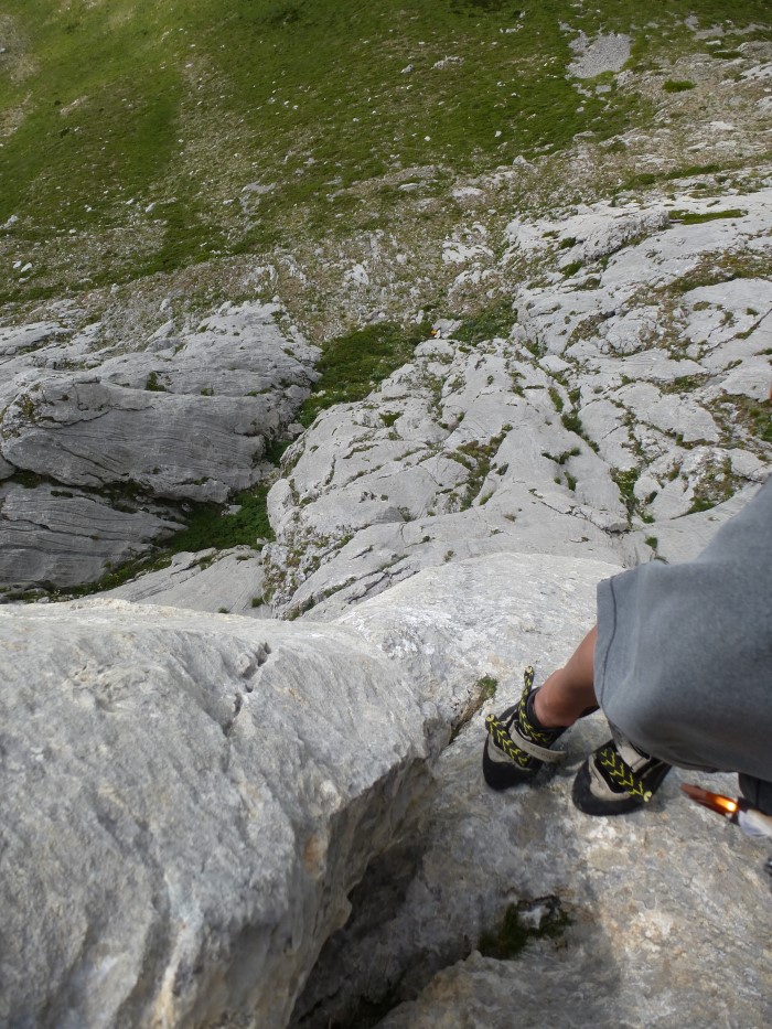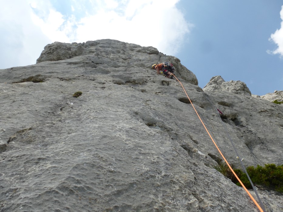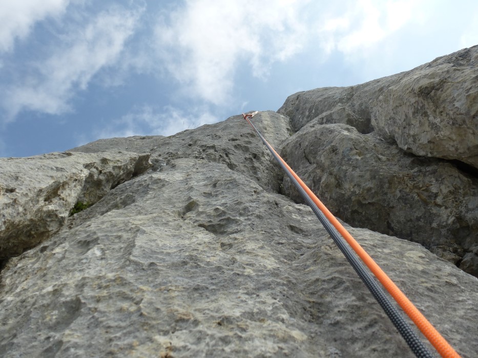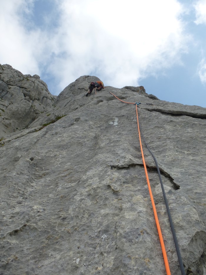 2º largo, 6a+/IV+. Secuencia del diedro de 6a+. Un poco raro si no se acierta con los pasos, bien asegurado con dos chapas y un cintajo.