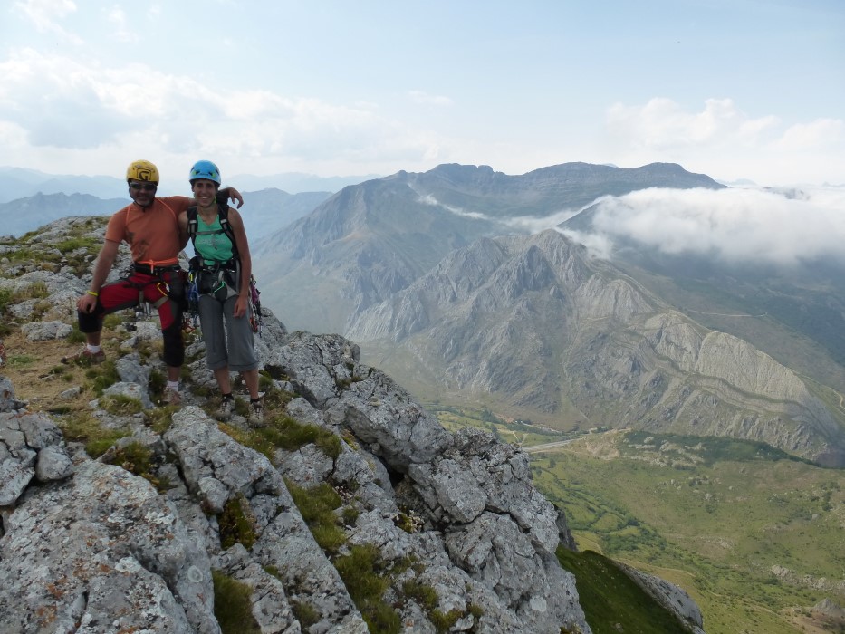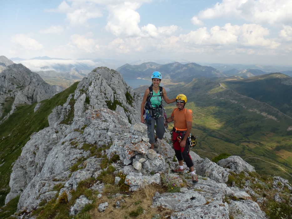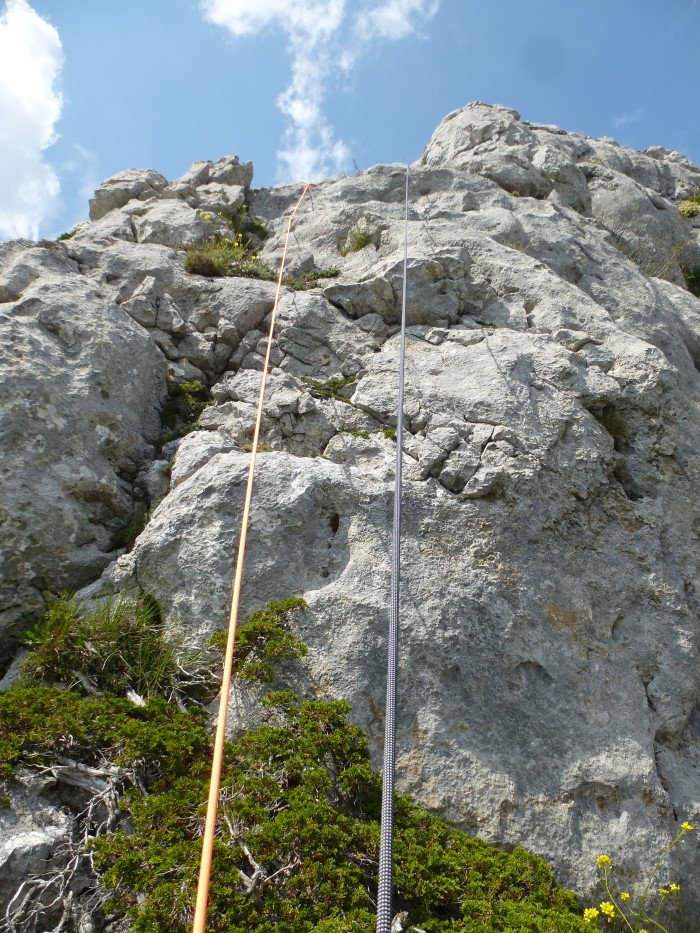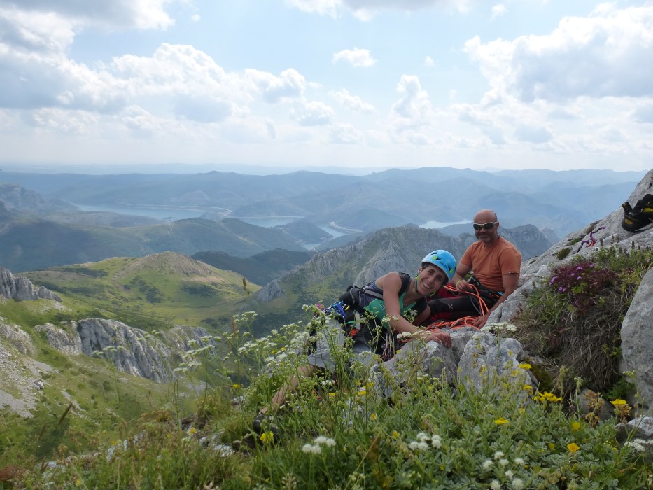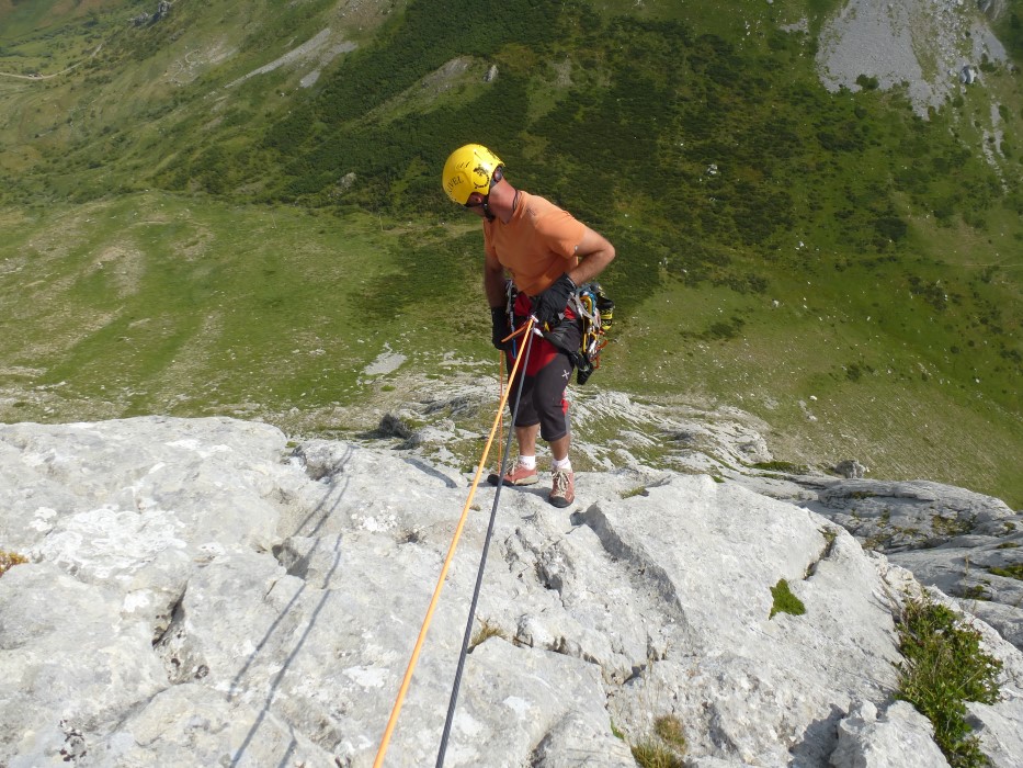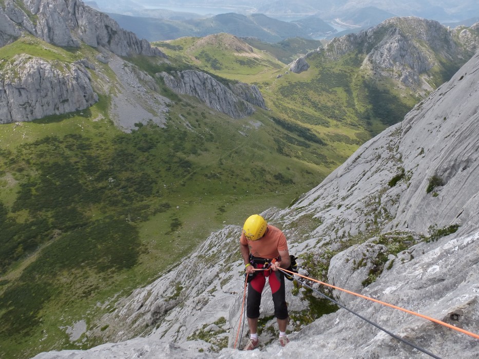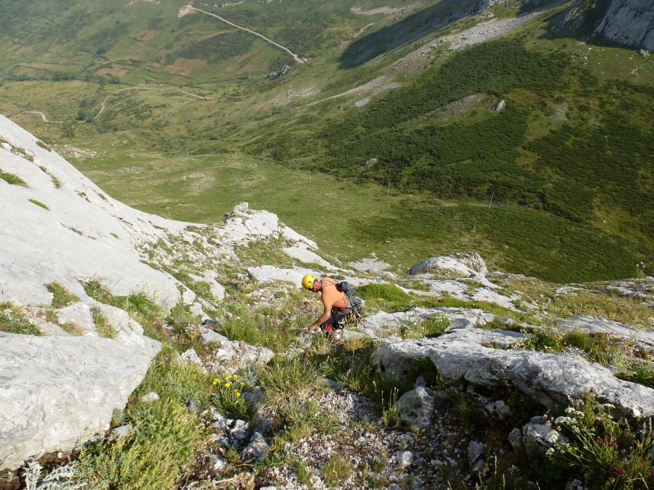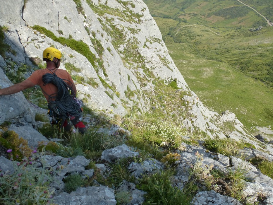Fotos de cumbre, y comienzo del rapel, que se encuentra a la izquierda de la vía según se sale a menos de 100 m. encima de un muro desplomado.