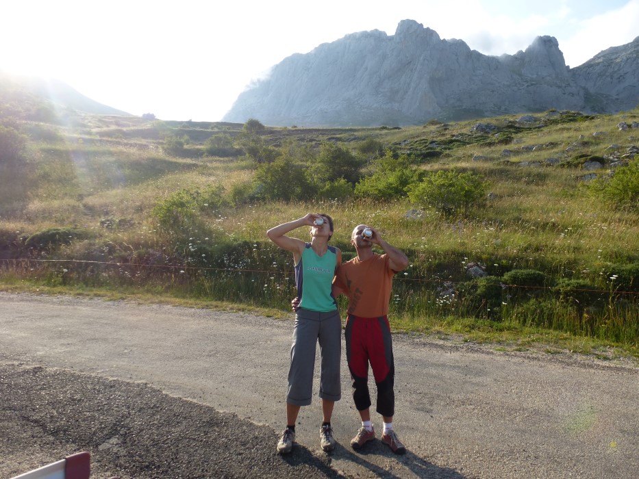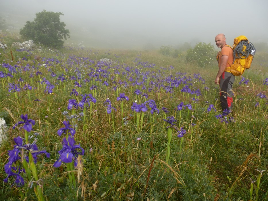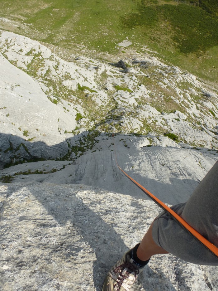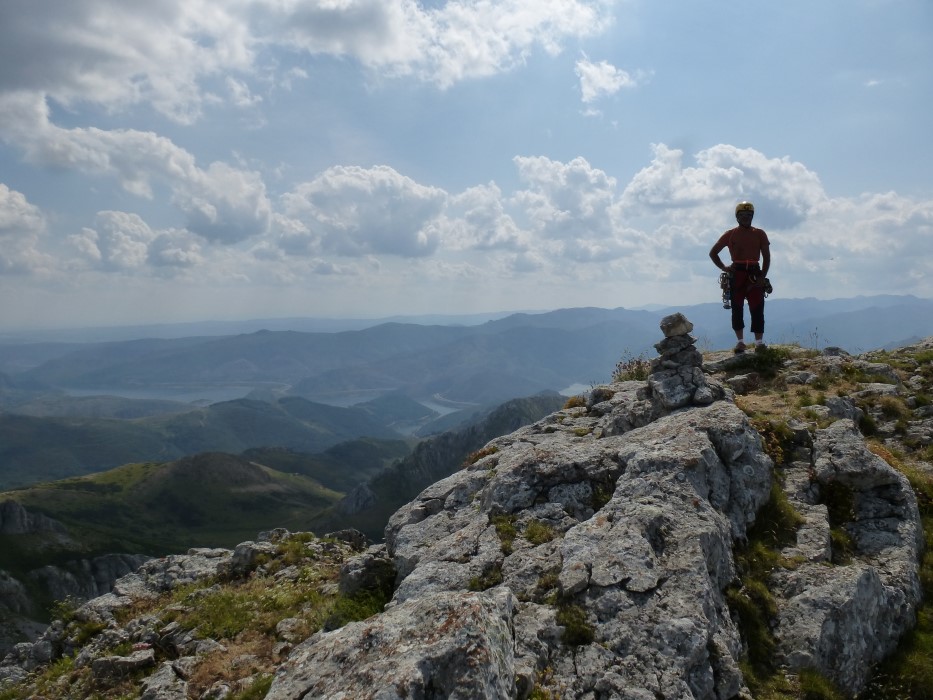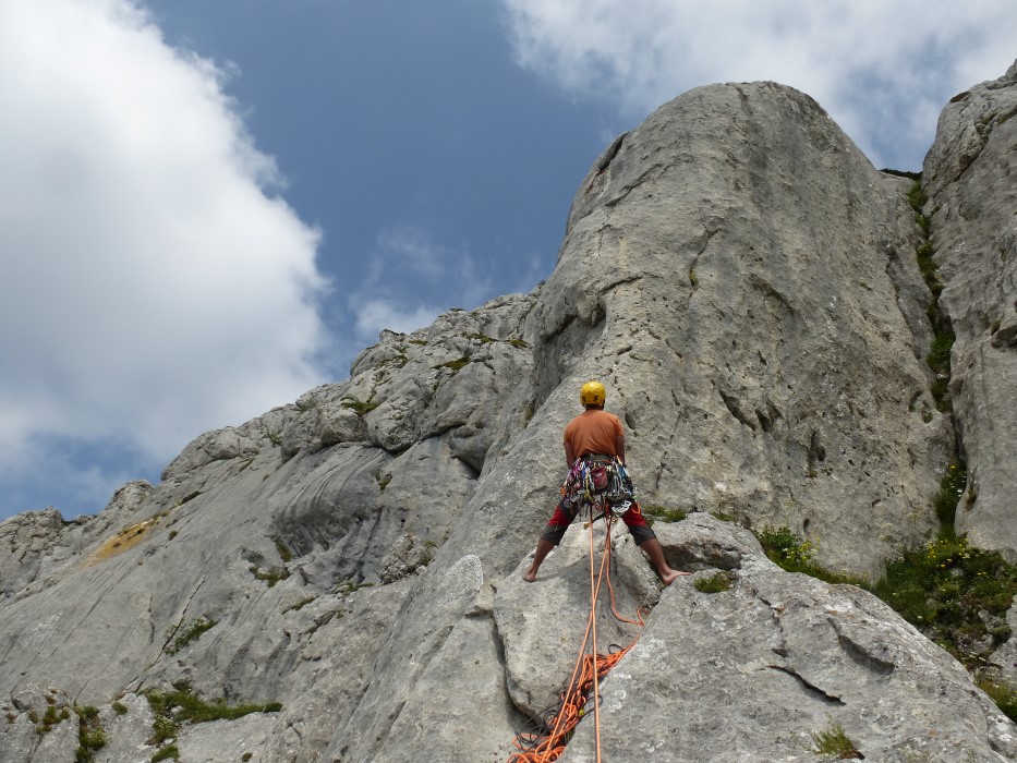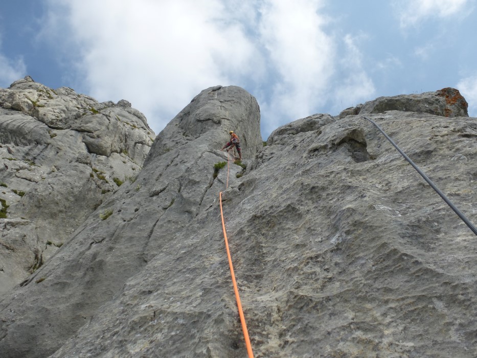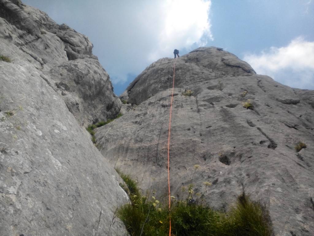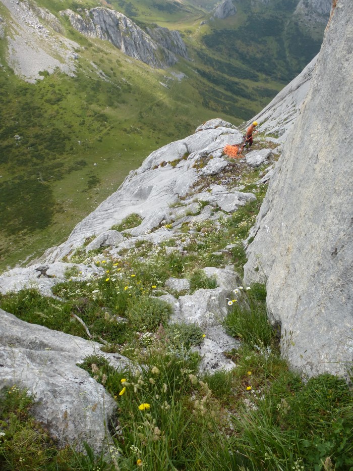 Fotos de cumbre, y comienzo del rapel, que se encuentra a la izquierda de la vía según se sale a menos de 100 m. encima de un muro desplomado.