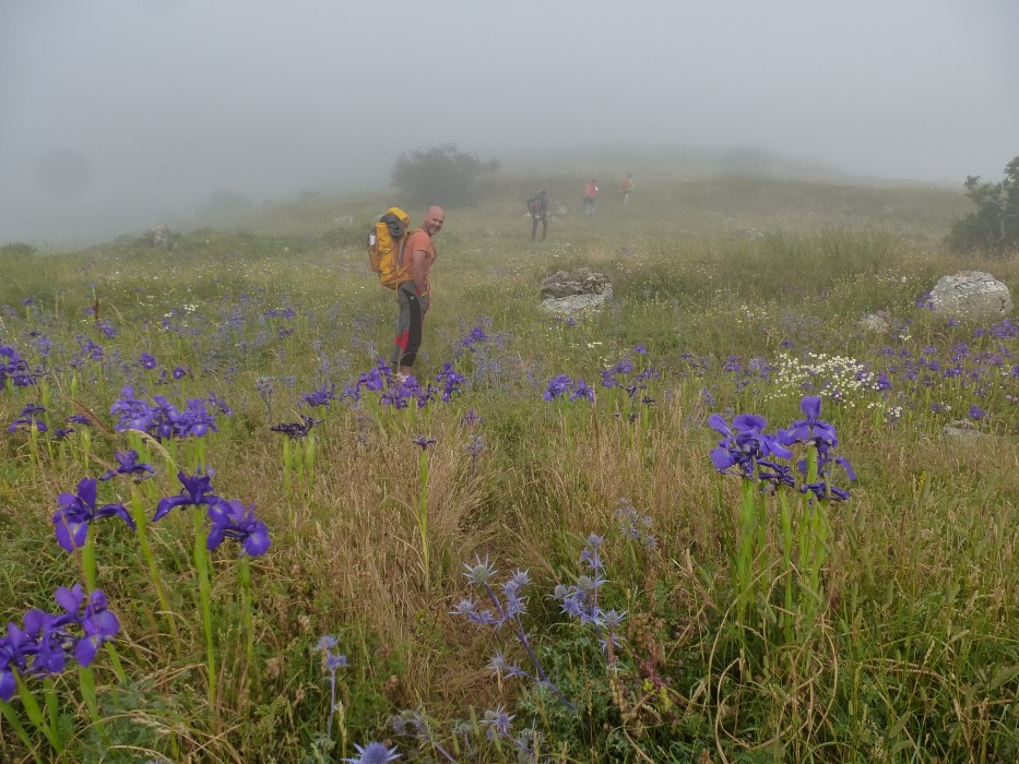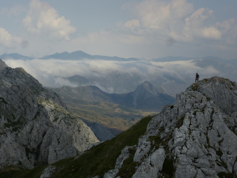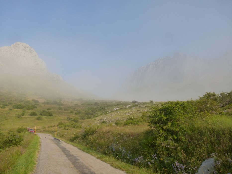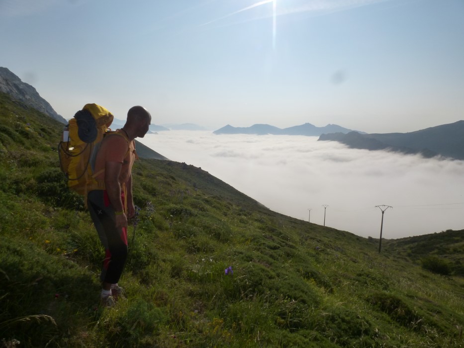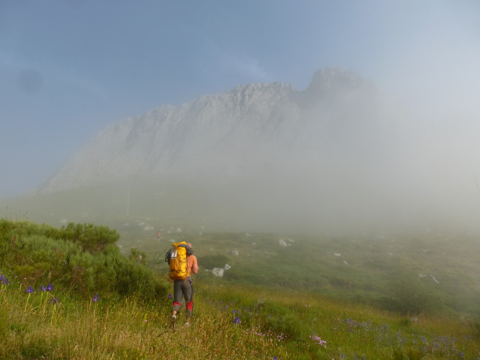 La niebla sube del valle y nos envuelve complicándonos un poco la subida.