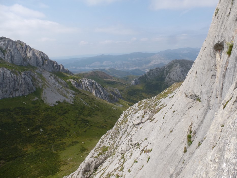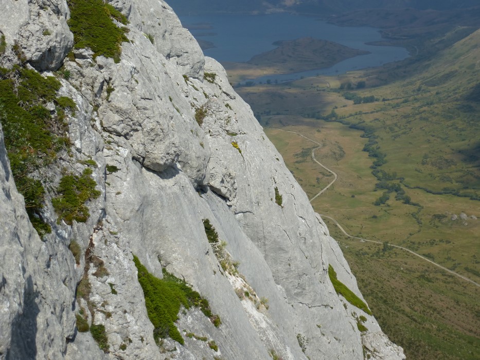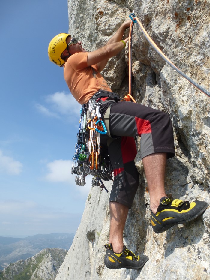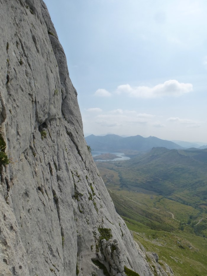 Del clavo se sale por la izquierda por una sección muy aérea y espectacular con mucho canto (V). Y últimos metros fáciles.