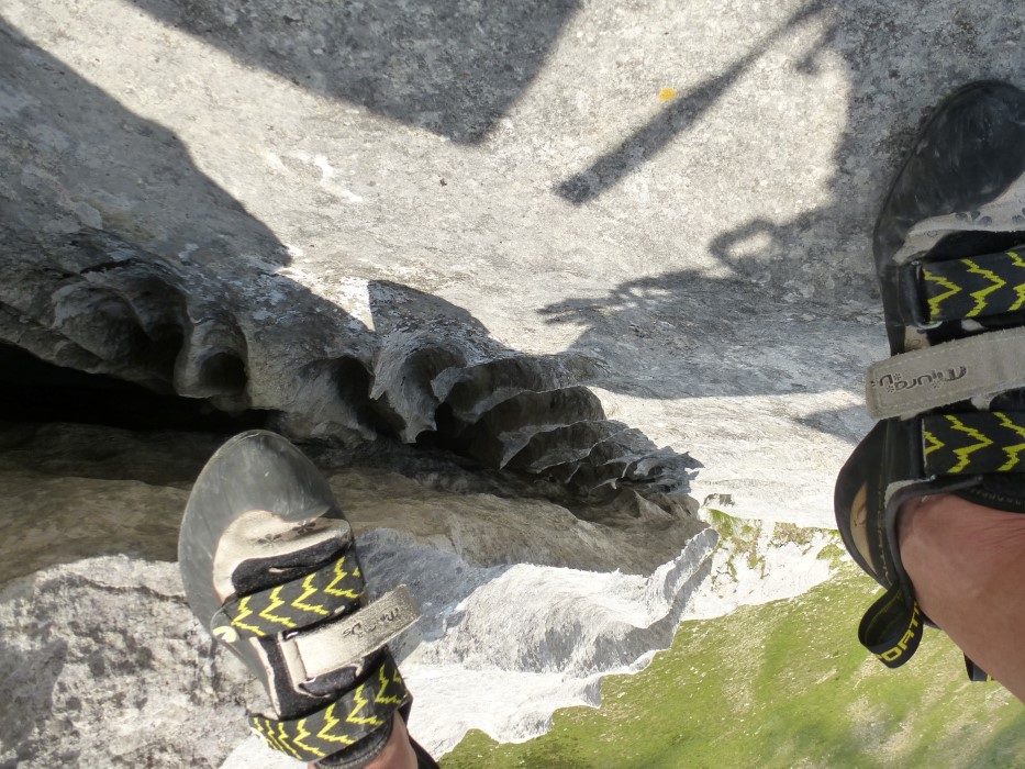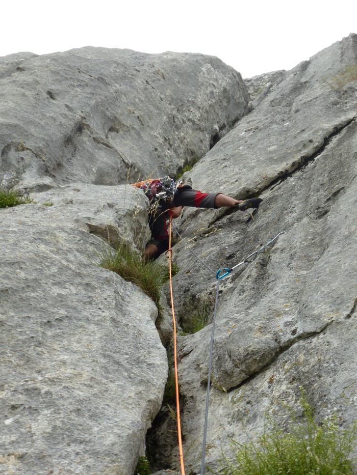Tramo final y reunión del primer largo, debajo del muro de salida del 2º largo, hay que montarla. Curiosas formaciones dentro de la fisura del primer largo.
