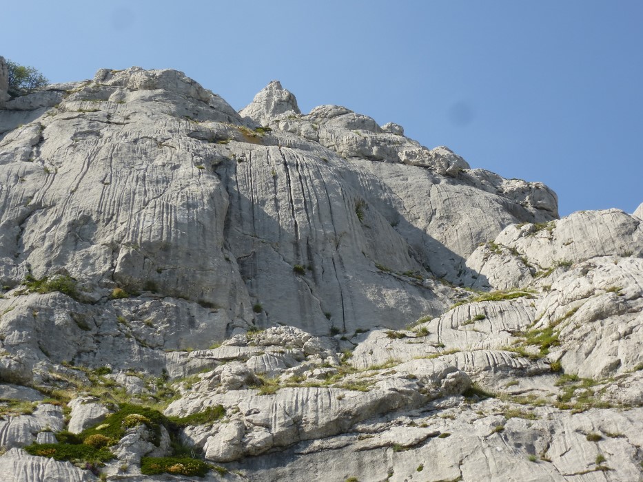 Muro compacto por donde discurre la vía senda Vertical y se rapela. Y la canal por donde se destrepa hasta gradas de descenso.