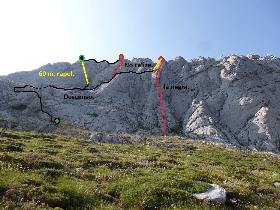 Descendiendo se ve perfectamente el espolón del tercer largo de 6c+ de la Negra.